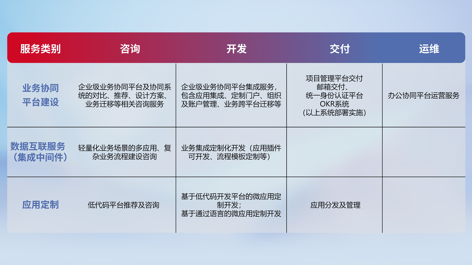 针对钉钉、、企微、、、IDaas等平台级产品提供产品的规划、、、、方案、、交付、、、定制化开发等服务,,,,实现如统一协同办公、、、智能客户服务、、、混合会议管理、、智能数据查询、、、等业务场景,,实现数字化转型。。。。